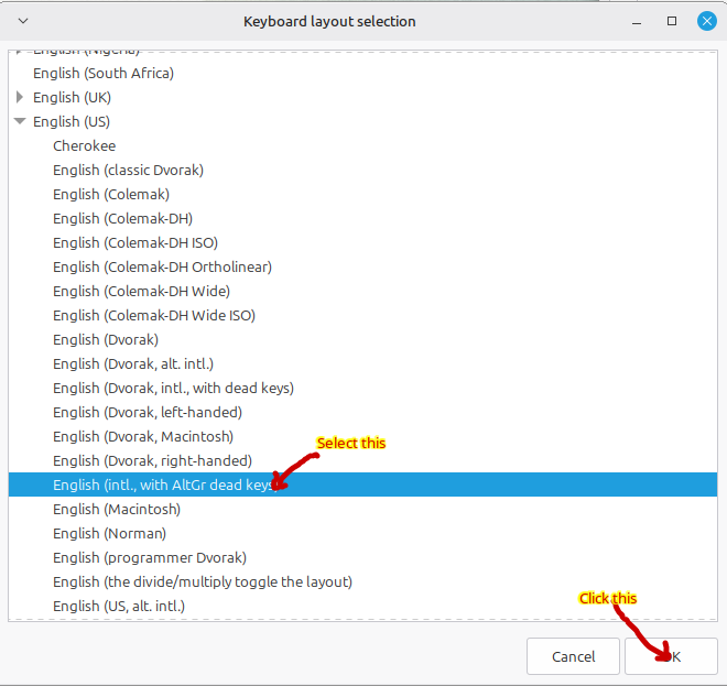 This will open the Keyboard layout selection window. Make it bigger and find English US and then underneath it select English (intl. with AltGr dead keys) and click the OK button.