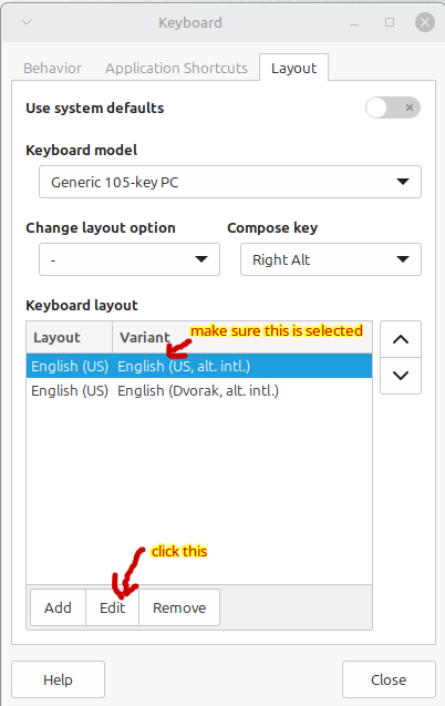 The problem is the English (US, alt. intl.) variant, which gives you grief when you try to type double-quotes. Make sure it’s selected and click the Edit button.